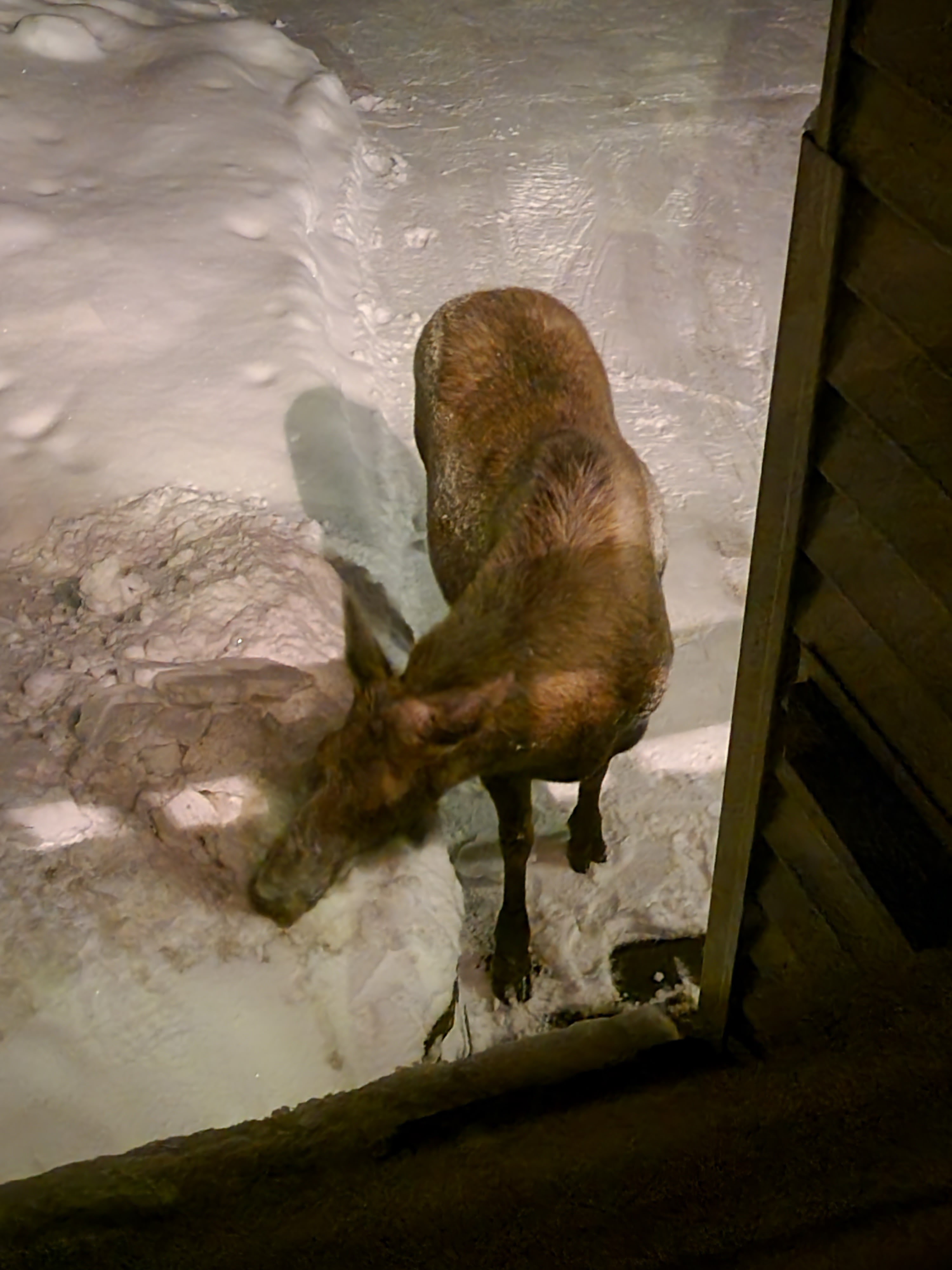 The moose, it seems, is also nocturnal and most likely to turn up around midnight. My best guess is the snow shovellers put down some salt when they were by earlier. I noticed the ice on the step was melting and they had not come back, so I shovelled the loose stuff up and tossed it on that snow berm, which the moose was happily sucking on here...so am guessing they must have put some salt down. Moose need salt and it's hard for them to come by in the winter. A few days ago someone posted on facebook that 4 moose were surrounding a vehicle licking all the salt off of it.